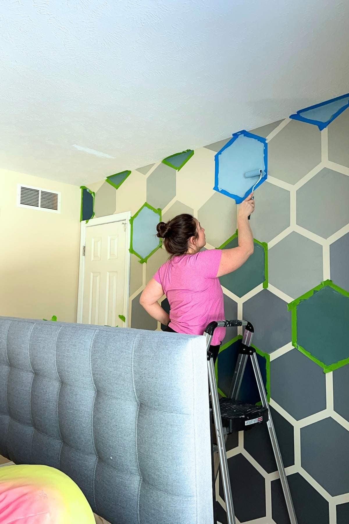 Since the design was already there, we retaped around the pink hexagons. Press your fingernail along the inside edge of the tape to help seal it to the wall.